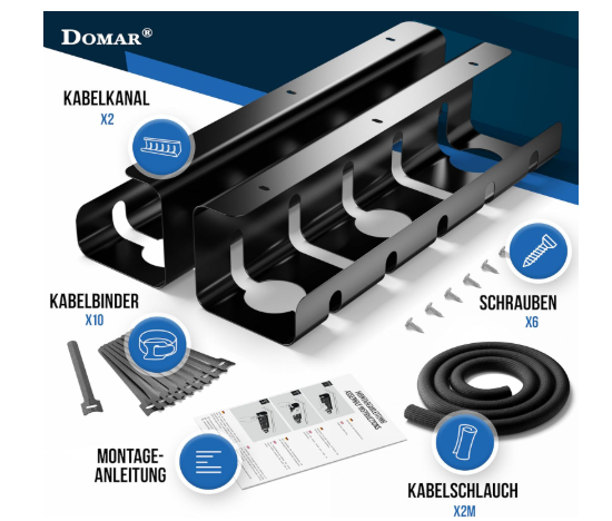 - Zusätzlich zu den Kabelführungen beinhaltet dieses Schreibtisch-Kabelmanagement-Set auch einen 2 m langen Kabelkanal für eine optimale Kabelführung unter dem Schreibtisch