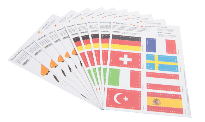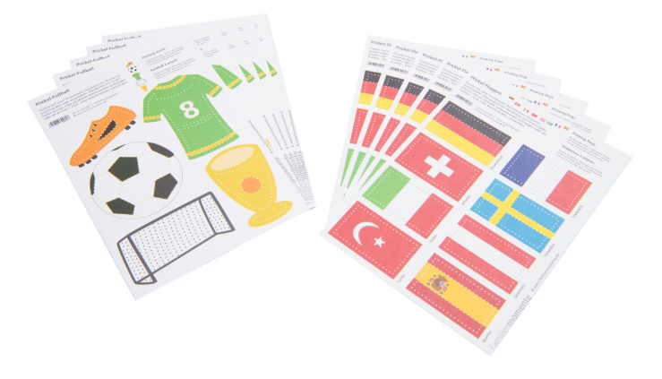 Die Motive mit vorgedruckten Punkten werden mit einer Prickelnadel (nicht enthalten) durchgestochen. Die entstandenen Löcher ergeben Muster. Schneiden oder prickeln die Kinder die Motive aus, können sie diese als farbenfrohe Mobiles verwenden. Fußballfans an die Prickelnadel!
