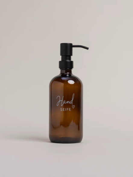 Das schöne Braunglas mit weißer Schrift macht den Seifenspender zu einem absoluten Hingucker in Eurer Küche oder in Eurem Bad! Der handgeschrieben Schriftzug “Handseife” sowie ein kleines Herz zieren die Vorderseite, der Eulenschnitt Schriftzug die Rückseite des Spenders.
